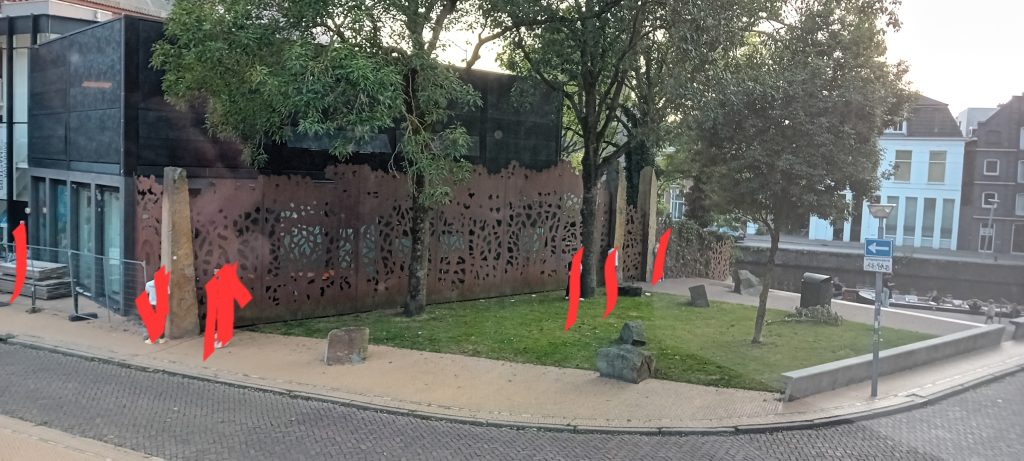 Zaterdagavond 17 augustus ’24. Er legt een BBC-/borrelboot aan bij de steiger aan Reitemakersrijge. Veel geschreeuw. Mannen, middendertigers, accountmanagers uit de zorgsector lijdend aan decorumverlies, schat ik, stormen de  wal op en plassen in plukjes van vijf tegen het cortenstalen hek van Minerva. Ze fotograferen elkaar trots. Enkelen, nog met een restje schaamtegevoel, wurmen zich achter de geplaatste hekwerken van de aannemer en staan uit het zicht. Zo’n 20 in totaal schat ik. Ik maak enkele foto’s vanuit ons huis. Mooi zo, denk ik. Klaar.