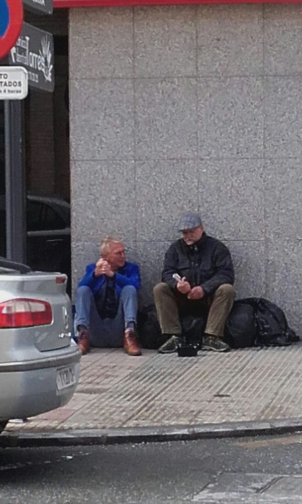 ’s Morgens ga ik hier zitten, op mijn in plastic zakken verpakte twee slaapzakken. Dit is alles wat ik heb. ’s Middags om ongeveer drie uur, krijg ik een warme maaltijd van een heel aardige Braziliaanse vrouw. Ik slaap op straat, dat wil zeggen bij de overkapte entree van een gerechtsgebouw, je weet wel, zo’n straatje waarlangs ze verdachten naar binnen brengen.” Terwijl we doorpraten verander ik van houding en ga even op de tegels zitten. Ik wil niets romantiseren, maar Wolfgang maakt bepaald geen zielige indruk. Terwijl ik met hem praat, worden er geen munten in het voor hem staande doosje geworpen. “Spanje bevalt me heel goed, het weer is prima. Nee, ik heb geen computer. Ik had een mobieltje, maar dat is kapot. Spanje heeft geen sociaal vangnet voor mensen als ik. Wel kun je per week drie warme maaltijden krijgen in steden als Antequera. Als ik me wil douchen, neem ik voor een nacht een kamer in een hostel, voor ongeveer € 15,-.” Zonder het te merken zijn we overgegaan van het Engels op het Duits. Wolfgang: “Ik spreek vijf talen: Spaans, Duits natuurlijk, Engels, Portugees en een heel klein beetje Nederlands.” Als ik wegga en hem groet geef ik hem mijn kaartje met (website)adres, kan hij het nog een keer nalezen. Ik besef dat ik hem in gedachten niet een bedelaar zou noemen, maar, eeh, een vrije dakloze. “Wolfgang, alles gute!”