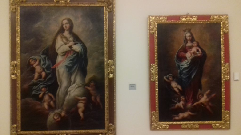saaie, want te bont geborduurde, overgooiers als werkkleding voor pastoors, kardinalen en bisschoppen. Verder geestelijke parafernalia van zilver en vormloze, kleurrijke, joekels van schilderijen van dimensieloze, blijde bijbelse taferelen die in hun eenzijdigheid, de gruwelen van de eerste vijf Bijbelboeken zijn hier niet te zien, de afgebeelde ongeloofwaardigheden slechts versterken.