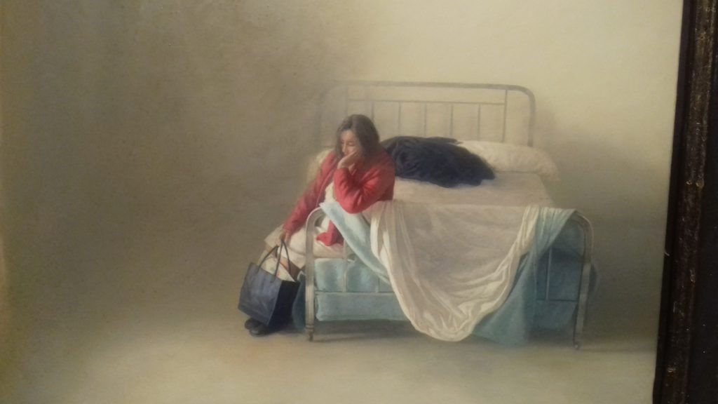 De zaal met Toral maakt ons bezoek de moeite waard. Fijn en realistisch geschilderde, verweesd en eenzaam rondkijkende vrouwen op bedranden, een dode emigrant naast zijn schamele bezittingen, heel veel troosteloos en treurniswekkende collecties dozen, opgestapelde meubels en kastjes. Ze willen je een verhaal vertellen dat veel verder gaat dan dat van de obligate kerkvaderen twee verdiepingen lager. De verwijzing naar de spullen die na deportaties van vele Joden in WOII overbleven, is glashelder. Toral klaagt de terroristische barbarij aan en noemt daarbij Daesh oftewel I S bij naam.