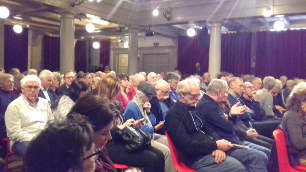 Zoals Dolberg na een fraaie actie juichend naar de trainer loopt, zo haakt Bert Wagendorp na een geslaagde grap graag aan bij de lach van zijn hoofdredacteur Philippe Remarque (dankzij Volkskrant-columnist Silvia Witteman bij mij beter bekend als Huisgenoot P) en literatuurrecensent Arjan Peters, zeg maar de Louis van Gaal van de VK. Beide mannen zitten pal voor mij. De een met schreeuwende happy socks en de ander met saaie zwarte kniekousen. Zou Sylvia zijn was doen, vraag ik me af. “Is uw vrouw hier, ik ben een fan van haar,” fluister ik Remarque in zijn oor. “Nee, ze houdt niet van sport,” is zijn zwakke excuus, alsof het onderwerp er iets toe doet. Nee, maar ze houdt wel van literatuur en de lezing gaat over beide, denk ik. Hij buigt zich voorover en toont de rimpels bij de slecht afgewerkte mouwinzet van zijn colbert. Heerlijk, zo’n doordeweeks dagje Amsterdam. Een gratis lezing van Wagendorp, stercolumnist bij de VK, vooral nadat NRC-hoofdredacteur Vandermeersch een keer in de societyrubriek van DWDD verklaarde Wagendorp graag in de NRC-stal te zien. Met een Kruidvatkaartje met het spoor naar de hoofdstad. Opvallend dat tegenwoordig elke machinist in zijn toespraakje naast de overstapkansen ook het gemis aan vertragingsminuten noemt. En in navolging van de CDA-leus de taalfout in ‘een hele goede morgen’ etaleert. De Rode Hoed is gevuld met senioren die het zich kunnen permitteren overdag gratis lezingen te bezoeken. Vintagejasjes, coltruien en extreem hoog opgetrokken broeken. De voorste rij stoelen is gereserveerd. Een grijze meneer knikkebolt nog voordat Wagendorp is begonnen. Een oude mevrouw gaat lekker op het bordje ‘gereserveerd’ zitten. Achter mij hoor ik een geprangde stem: “Hèhè, we gaan eindelijk weer eens uit onder leeftijdsgenoten,” en even verder gekweld: “Ik moest lessen Nederlands overnemen. Ach, wilde ik wel hoor, maar de bijgeleverde teksten zaten vol fouten.” De klaagzang stopt als Stijn Fens plaatsmaakt voor de spreker van dienst. Wagendorp houdt een schitterend betoog over sport (de belangrijkste bijzaak die bestaat) en Fens (ooit een rechtsbenige linkermiddenvelder). Sport wordt draaglijk door fictie. Buddingh, Krabbé, Mulder zijn de meestervertellers. En natuurlijk Fens en Wagendorp. Vanwege zijn steeds afzakkende bril oogt Wagendorp wat breekbaar. Zonder gene verheerlijkt hij Abe Lenstra, de beste voetballer ooit, en verguist hij Johan Cruyff dankzij wie wij twee wereldkampioenschappen zijn misgelopen. Wagendorp, humoristisch, op het cabareteske af, Groenloër met Friese roots, spaart Amsterdam en Ajax niet. Wagendorps tekst is al vooraf te koop voor € 5,- Ik vrees papiergeritsel met al die oudjes, zoals meelezers bij de Matheus Passion een extra roffeltje invoegen bij Jezus’ lijdensweg als het einde der pagina’s wordt bereikt, maar het valt mee. De Rode Hoed is niet uitverkocht en dat is jammer. Of regeert hier de wet van de gesponsorde stoelen waarbij vooraf bestelde stoelen niet bezet worden omdat de kaarteigenaar liever naar een paaldansclub verderop gaat?