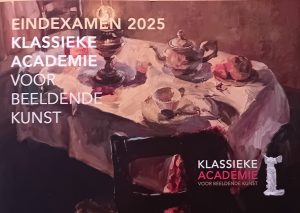 ZONDAG We kunnen het niet laten en bezoeken de eindexamenexpositie van de Klassieke Academie in Pictura. We zien 169 voornamelijk eendimensionale werkstukken/jes van twaalf vrouwen en één man, verkoopklaar met prijzen tussen € 90,- en € 3.000,-. Mijn prangende vraag ‘Doet het iets met mij?’ beantwoord ik met ‘nee’. Zeker, we zien mooi werk, goed zelfs, maar ook veel ‘braaf’ en ‘gewoon’ om maar niet ‘gewoontjes’ te zeggen. Ik doe moeite me niet door de titels (geloof / voetwassing / gebroken nacht na de preek / gisteren jarig / het werk van predikant) te laten beïnvloeden. Of je deze parttime (avond)school à € 3.900,- per jaar een academie kan noemen blijft in mijn hoofd zoemen. Ik mis inclusie, maatschappelijke relevantie.