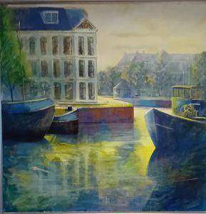 DONDERDAG: Een van de mooiste werken in de Martinigangen is een schilderij van de Noorderhaven in Groningen. Google leidt me naar Theo Onnes (Uithuizen), de maker. Anders dan veel schilderijen met de Groninger A als onderwerp zien we hier ingetogen kleuren met als aandachttrekker een mysterieuze gele gloed op het water. Even denk je ijs te zien maar de bomen halen je uit die droom. De witte klassieke gevel en de drie scheepsrompen stimuleren ieders fantasie. Over Onnes verscheen onlangs het boek ‘Zichtbare verwondering’ van Sijens/De Vries.