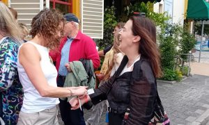 Ik kom voor ‘Grunnegers in het gruin’, Groninger poëten, waaronder, oeps, dus een Nijmeegse. De vier vrouwen hebben mooie stemmen en ik geniet van de streektaal. Van Berendschot excelleert met voor mij onnavolgbare tongue twisters. De Graaf herdenkt liefdevol een gestorvene die mij de grondbeginselen van zeismaaien bijbracht. Ook heeft ze een lofzang op woordenboekmaker Ter Laan, één harer grote vrienden. De arme man was zo met zijn eigen taal bezig dat hij vergat dat er mensen zijn die zijn taal willen leren zodat we ons suf blijven zoeken naar een propere Nederlands – Groningse versie. De Roo draagt een mooi vers voor over haar overleden vader die ze het beste op de dijk herinnert. Taalconsulent/organisator Gosselaar is een beetje de theaterdirecteur die naar het podium haakt en  haar eigen kunst demonstreert met mooie Groningse verzen en één nog in de niet-vertaalde fase.