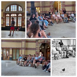 ZONDAG: ‘Salle des pas perdus’ is de bijnaam van de Groninger Stationshal. Voordat ik, uitgenodigd door NS, wat gedichten ga voorlezen kijk ik omhoog en verbaas me over het plafond en de indrukwekkende tegeltableaus van de Groninger (Ploeg)kunstenaar F.H. Bach. De hal is een zogenaamde ‘salle des pas perdus’, een zaal waarin voetstappen verloren gaan. Dit verwijst naar de akoestiek van de hal, maar ook naar de functie. Zowel vroeger als nu en straks is het een wachtruimte waarin mensen rondwandelen om de tijd te doden en dus min of meer nutteloos hun voeten verplaatsen. Deze prachthal in het mooiste stationsgebouw van Nederland, is mijn trigger. Nog een bijnaam van de hal: ‘Kathedraal van het gevleugelde wiel’.  Naast het Peerd van Ome Loeks op het Stadsbalkon heb je prachtig zicht op de gevel met zijn mix van laatgotische versieringen, roosvensters en renaissancistische topgevels. Hoe mooi dat NS Groningers de kans geeft de vloer te nemen. Mijn verzen Atsje, Zomertuin/Simmertún, M. Verstappen, Drentsche Aa alias Jongbloedvaart, Maxima, Pieter Omtzigt, Op fietse noar Emmen/alias Woar je zunder kin, Zesentwintig,  Afrodisiacum baden in de fijne akoestiek.