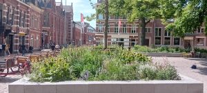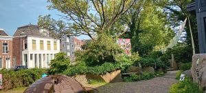 Ondertussen kijk ik om me heen. In onze omgeving komen we er niet bekaaid af. Voor de A-kerk is een aantrekkelijk miniatuurparkje met hoge bomen. De kenner ziet een overeenkomst met de fameuze tuinen van tuinarchitect Piet Oudolf. Gekleurde ijzeren stoeltjes maken het af. Op de grond in het grind de artistieke koperen belijning van de contouren van de vroegere toren.