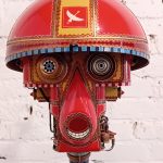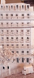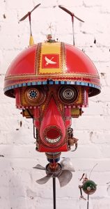 ZONDAGMIDDAG We bezoeken Museum Kosmotroniks in Westerhavenstraat, waar twee kunstenaars exposeren. Harry Arling met Kosmotroniks in plastic en Wijnand Driessen met architectuur in karton. Arling interviewde ik ooit als Stamgast in het A-Kwartier. Driessen werkt tot in millimeters met architecturale kartonnen sculpturen: een Parijs of Japans huis, compleet met superfijn uitgesneden details, alles in kartonkleur. Arling gebruikt plastics en materialen uit de oude doos die hij tot ingenieuze, magische, sprookjesachtige, kleurrijke (soms mechanische) objecten transformeert, veelal met beweegbare onderdelen en uitgekiende lichtjes. Het Groninger Museum kocht werk van Arling aan.