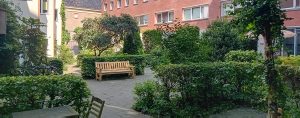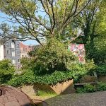 Achter ons huis ligt onze met veertien buren gedeelde binnentuin. Delen is het nieuwe hebben. Een oase van groen in een weldadige rust. De tuin lijkt op een hofje, maar is – helaas – ontoegankelijk voor derden. We onderhouden de tuin gezamenlijk, organiseren eens per jaar een maaltijd met zijn allen en proberen naar elkaar om te kijken. Met vier jonge gezinnen erbij is het geen knarrenhof. De huizen, alle met drie trappen, spotten met het achterhaalde begrip levensloopbestendige traploze huizen.
