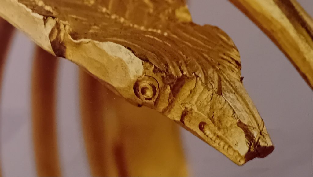 Het goud van de Daciërs. Ga even zitten: terwijl de Drenten, toen natuurlijk nog Proto-Friezen geheten, niets anders deden dan, gehuld in sexy geitenvellen, in hun vrije tijd grote keien omtoveren in fijnmazige luxe hunebedden en wat vuistbijlen slijpen om opdringerige buren de schedel te splijten, maakten ze dik 2000 km verderop gouden en zilveren sieraden waar museumkaartbezitters nu hun vingers bij aflikken. Als toppunt van uitbundige versierdrift zien we gouden opsmuk van koeien- of paardentuig. En dat allemaal gefixt in het land van Dracula, van de 20e eeuw voor Christus tot de derde erna.