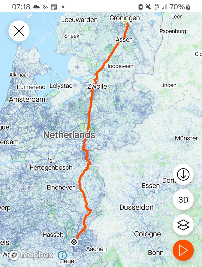 19 juli 2024. Woorden als ‘bizar’, íconisch’ en ‘episch’ ken ik niet. Het wordt een bijzondere rit. Mijn fietsmaat noemt het op Strava: ‘Morning ride met Klaas’. om 02.45 opstaan en rijden om 04.10.  Ruim 2 kgs in de rugzak. Het worden 339,91 kms. Nog wat data: beweegtijd 12.36 uur. Verstreken tijd 16,54. Gemiddelde snelheid 27. Hoogteverschil 973 m. Maximale snelheid 51,4.