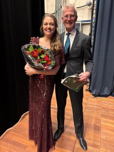ASSEN, de Nieuwe Kolk. Als de gordijnen opengaan zien we enkele open rijen in de zaal, reden voor een extra inspanning. Pianist Andy Booth, sopraan Donij van Doorn, dirigent Etty van der Mei en het koor doen hun best. Erna en ik fotograferen elkaar met de solisten.