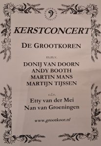 (¹ Grootkoor Nederlands is een bedrijf met vestigingen in het hele land. Twee eigenaren/dirigenten jakkeren het land door om repetities te leiden. In elke provincie wordt amateurzangers de gelegenheid geboden zich te preppen voor een goed bezocht (kerst)concert. En ja, de koren zijn ook groot, Grootkoor Groningen telt tegen de 200 zangers. En ja, de deelnemers zijn niet de jongsten. En ja, de sleetse teksten schuren als een gek voor weldenkende agnosten en atheïsten. En sja, of de curieuze wijze van alles handje contantje afrekenen, nog in deze tijd past, vraagt natuurlijk iedereen zich af.)