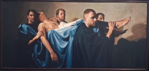 In de pauze vergapen we ons aan de imposante perfect geschilderde levensgrote bijbelse taferelen van Egbert Modderman langs Martini’s gangpaden. De argeloze kijker fantaseert over wat we nu in Israël dagelijks voorbij zien komen: onderdrukte, geketende, vermoorde Palestijnen in mensonterende toestanden. De kunst en het nummer ‘Peace like a river’ katapulteren me naar het Midden-Oosten waar, ondanks het overal maar niet in Israël geldende oorlogsrecht, de gruwelijkste oorlogsmisdaden plaatsvinden jegens Palestijnen.