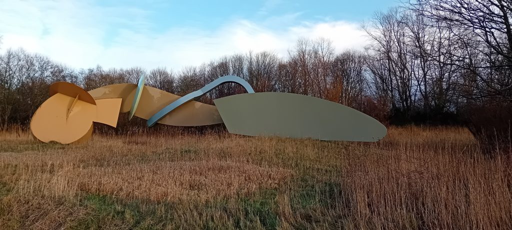 DONDERDAG Mijn fiets brengt me naar Grijpskerk en Kommerzijl. Ik laat me rijden en volg waar de wielen naartoe willen. Onderweg een groot, magisch, stalen kunstwerk (1997, van beeldend kunstenaar Gert Jan Mulder). Een mier? Vooral de in het landschap blendende kleuren maken indruk op me.