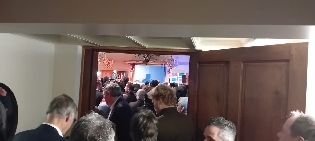 MAANDAG De enige mogelijkheid om burgemeester Ard van der T. van Westerkwartier, waaronder omgekeerdevlaggendorp Marum ressorteert, te spreken is naar de demografisch homogene koker van de nieuwjaarsreceptie van de provincie gaan. Als bijvangst hoop ik op Roos G., museumdirecteur. Het is erg druk. Ik loop wat rond en ga bij de trap staan, mijn fuik, en zie het sympa hoofd van Van der T. Ik maak me bekend als VBFsympatisant ¹ en dat Marum nog niet schoon is. Of hij het VBF steunt. Vriendelijk maar beslist klinkt: ‘Nee, diefstal van persoonlijke eigendommen is verboden.’ ‘Meneer Van der T., schaamt u zich niet kapot dat juist in uw gemeente de vlaggen, nu, net voor het 80-jarig bevrijdingsfeest, nog steeds omgekeerd hangen langs de snelweg?’ ‘Nee,’ antwoordt de burgemeester. ‘Iedereen heeft recht op zijn mening en mag dat ook op zijn eigen terrein uitdragen.’ Van der T. haalt nog een arrest aan. ‘En als ik u was zou ik voorzichtig zijn. U maakt zich nu bekend als sympathisant van een wetsovertreder. Strafbare feiten als diefstal kunnen vervolgd worden.’ Ik bedank hem voor zijn waarschuwend meedenken.