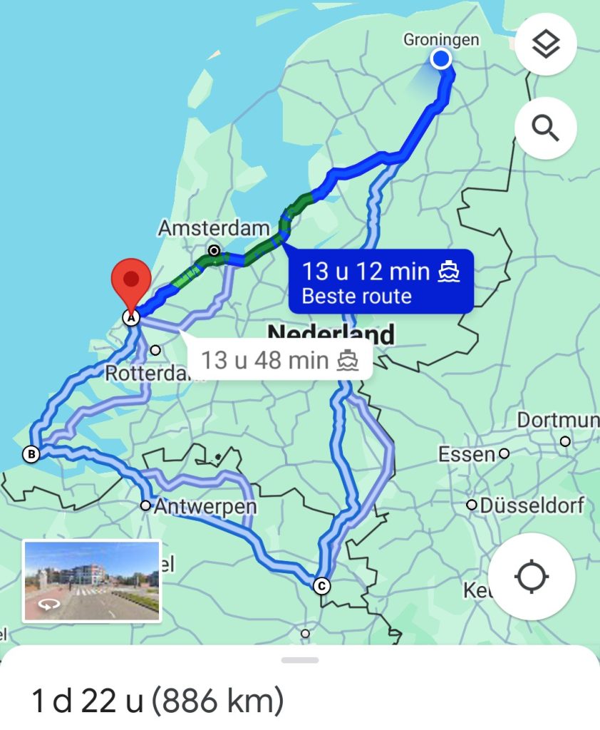 MAANDAG. Met fietsmaat M spreek ik fantaserend over Maastricht – Groningen in één dag. Kortste route is 323 kms. Dat wordt 12 uren fietsen. Dan nog zes pauzes van 20 à 30 mits. Dagje werken zal het wel worden. Voor fietsmaat M is de grootste opgave zich aan mijn tempo aan te passen. Hij stelt een alternatieve route voor: vrijdag: Groningen – Amsterdam – Rotterdam – Vlissingen, zaterdag: Vlissingen – Antwerpen – Maastricht; zondag freewheelend met mij: Maastricht – Nijmegen – Zwolle – Groningen. Totaal 886 kms. Beiden blij.