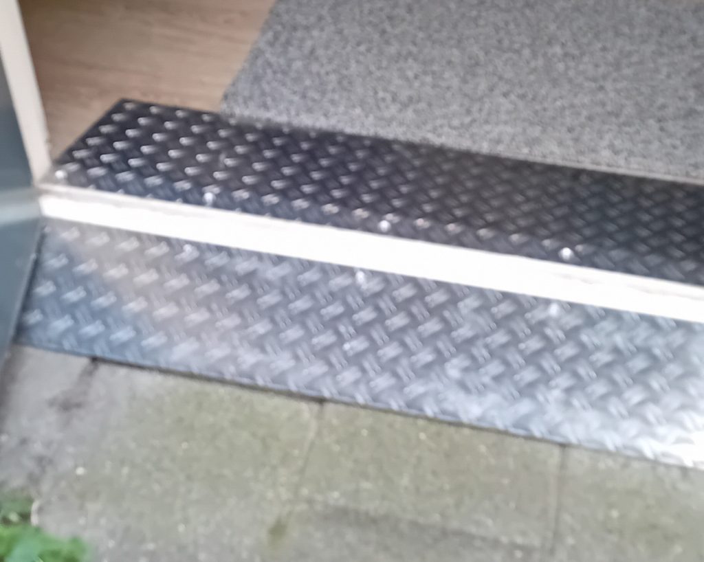 Dinsdag Twee traanplaten maken de drempel doable voor de Van Raam. Metaalbedrijf Agema weet precies wat ik bedoel en fixt het.