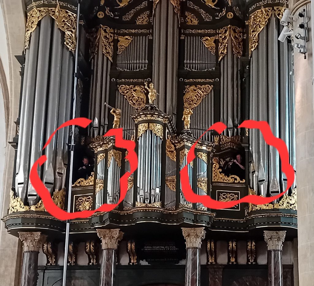 Zondag De Martinikerk loopt vol. Nou ja, nog niet zo vol als bij het kerstconcert van het Grootkoor natuurlijk, maar orgelmuziekvol. Paar honderd man zeker. Het IMOCG¹-openingsconcert heet Venetiaanse Pracht met het blazerskwartet Les cornets noirs. Even hoop ik op ‘cornetists noirs’. Maar nee, vier witte mannen uit Zwitserland die ongehoord mooi spelen op aparte fluiten: dulciaan, twee zinken² en trombone. Ze staan vanuit (te) kleine openingen in het Schnitgerorgel hun best te doen. Centrale muzikale truc: samen met organisten Wiersinga en Van Doeselaar zoveel mogelijk echoën. Meesterlijk. Voor me zit een meneer die op het oog ongecontroleerde kleine schokkende handbewegingen maakt en constant ‘formidable’ en ‘incroyable’ inslikkend roept tegen zijn vrouw die haar nagels met Dior Vernis heeft gehighlight. Monsieur is misschien een dirigent uit de banlieues die de Olympische Spelen-herrie ontvlucht en nu op de camping in Middelstum-Noord staat. De muziek bekoort zeker en vast, maar ja Gabrieli, Allegri, Cima, Merulo, Valentini en Guami zijn mooie namen van Ducatiberijders op het TT-circuit maar halen het natuurlijk niet bij de letters b a c h, of is het de overkill aan herhalingen die mij parten speelt? In de pauze regeert Calvijn met een lange wachtrij, lauwe thee en haperende wifi. Burgemeesters die omgekeerde vlaggen tolereren zitten op de voorste rij.