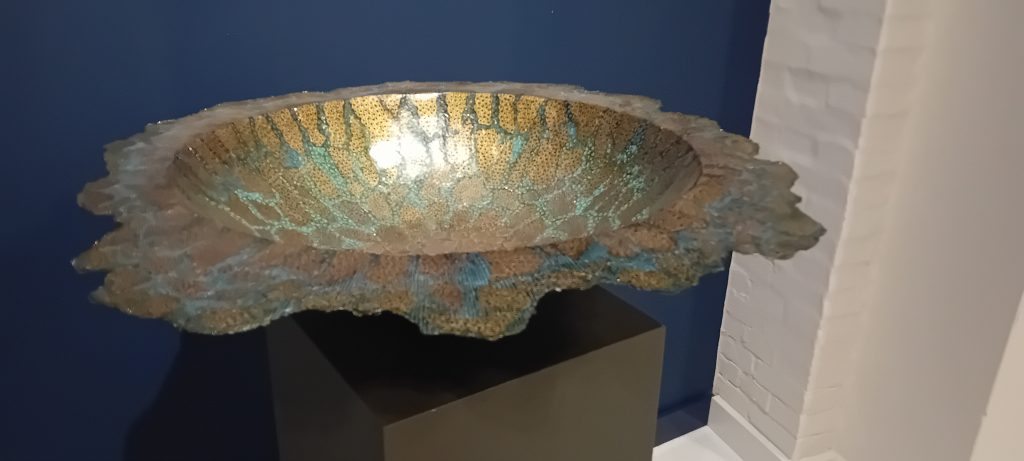Woensdag: De Ploeg exposeert in (Hotel) Watertoren West. Om de twee maanden twee Ploegleden. Deze keer Reinier van den Berg en Joke Klaveringa, aangevuld met Eva Ouden Ampsen. Van den Berg en Klaveringa ken ik inmiddels goed. Ouden Ampsen is nieuw voor me. Zij exposeert schalen. Die ogen zwaar maar zijn superlicht. Niet gemaakt van gebakken klei maar van gescheurde, op elkaar gelijmde laagjes karton, later in herfsttinten beschilderd en van stipjes voorzien. Vergeleken met de prijzen van Van den Berg (van € 1.750,- tot € 2.250,-) en Klaveringa (van € 525,- tot € 925,-) is Ouden Ampsen niet duur € 250,- tot € 400,-).