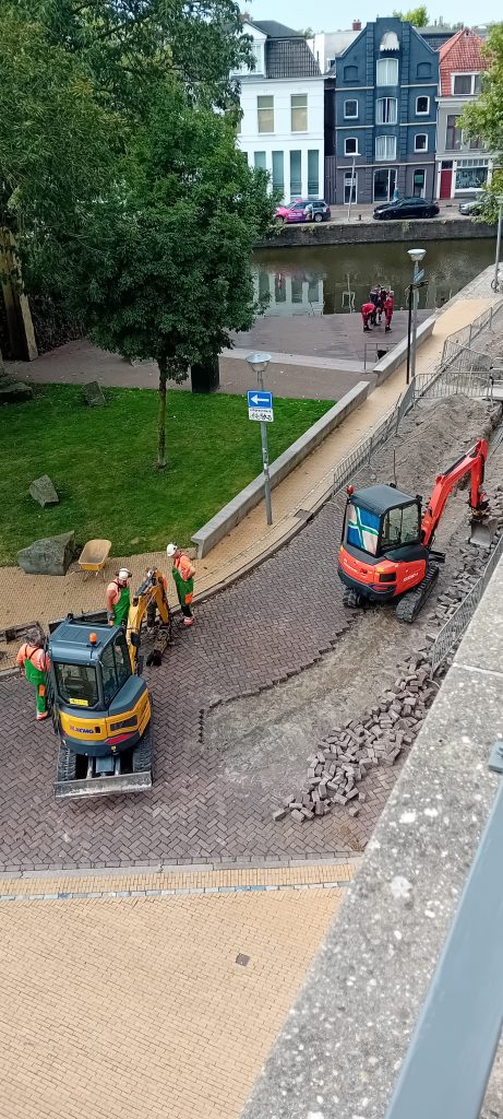 Maandag: De straat is opgebroken. Voor ons huis staan een schaftkeet en een dixie, afgeschermd door wat schrikhekken. De BAM-infra-mannen beginnen om 07.00 uur, een enkeling om 05.46. Ze staan in de gleuf voor nieuwe elektriciteitskabels. De graafmachine schraapt voorzichtig grond weg. Bij een dwarsliggende leiding begeleiden twee mannen de graafmachinist. Is de graver voorbij de leiding, dan kantelt de graafbek en wordt de grond onder de leiding weggelepeld. Ik vraag hun of dit onder de noemer zwaar werk valt. ‘Ja,’ klinkt het unisono.