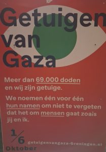 MAANDAG In Amsterdam deden 250.000 mensen mee met een Rode-Lijn-demonstratie tegen de genocidale Israëlische barbarij in de Gaza-streek. In Groningen lezen verdeeld over vijf dagen zo’n 250 mensen 24/7 namen voor van 69.000 Palestijnse en Israëlische slachtoffers: mannen, vrouwen, kinderen. De gelegenheid hieraan mee te doen grijp ik met beide handen aan. Graag. Van 06.00 tot 08.00 doe ik mee en ervaar het als indrukwekkend. Al namen lezend trekken foto’s van slachtoffers aan mijn gedachten voorbij.