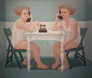 ZONDAG Galerie Peter ter Braak presenteert twee beeldend kunstenaars: meubel- en lampenmaker Hans Endendijk en schilder Joyce Eijkhout. Endendijks truc: zonder lijm of schroeven maakt hij zitmeubelen met prachtige ronde vormen. Zijn techniek: er worden stalen kabels gespannen door gaten in houten balkjes die afgeschuinde zijkanten hebben. Door de kabels strak te spannen ontstaan de vormen. Bij Eijkhout valt het tweelingthema op. Koele, stoïcijnse koppen: vervreemdend en surrealistisch.