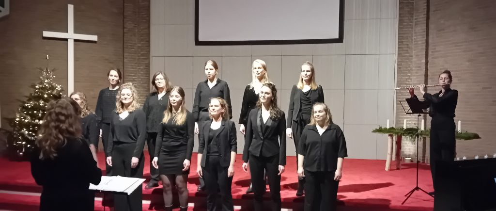Nova: dertien jonge vrouwen zingen de sterren van de hemel. Soms in wisselende formatie. Ze worden bij elkaar gehouden door muzikale draden en Mirna’s handen, vaak begeleid door een piano, soms verstevigd door het orgel of een dwarsfluit. Het publiek geniet. Vrouwenkoor NOVA zingt drie- en vierstemmig. Een perfecte dynamiek, spatzuiver, alles uit het hoofd. Dirigent Mirna Westra dirigeert met minimalistische handbeweginkjes en een subtiel bewegend lijf. De zangeressen zingen alsof ze nooit anders doen. En, – niet onbelangrijk – ze stralen plezier uit. Pianist Cas Straatman voelt de pianissiomo- en fortissimo-passages precies aan. Bij ‘On this holy Christmas night’ speelt Marlinda Krol – Wenselaar de dwarsfluit. Het heldere fluitgeluid weerkaatst door de met hoge trekstangen bijeen gehouden octogonale ruimte ver boven de sexy vuurrode hoogpolige vloerbedekking.