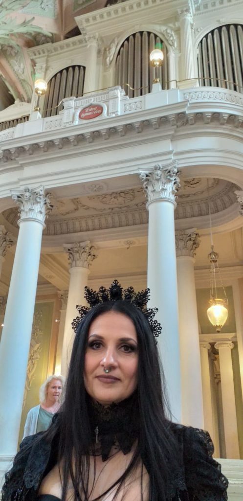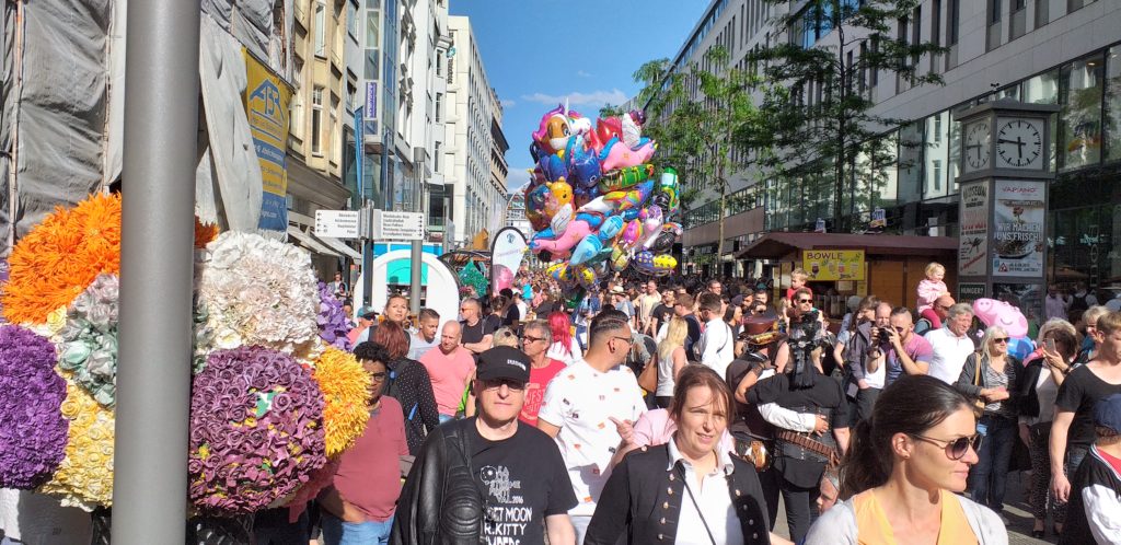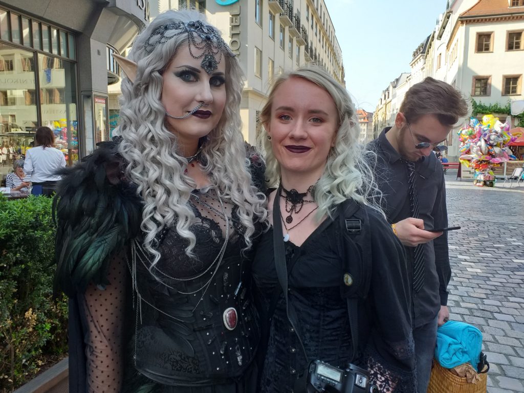 Drie concerten in twee dagen, dat is in Leipzig een makkie. In het weekend worden er in de Thomaskirche en de Nicolai Kirche allerlei concerten georganiseerd. Eintrittspreise zijn vaak € 2,- maar dan moet je ook een prevelement van een Pfarrer(in) voor lief nemen. Die van de Nicolai Kirche gaf desgevraagd als reden dat men op zeker moment meer waar voor het geld wilde bieden. In het pinksterweekend wordt Leipzig overspoeld door duizenden verkleden die Gothicje spelen. Het ‘Wave Gotik Treffen’ trekt liefhebbers uit alle hoeken en gaten uit Duitsland en ver daarbuiten. We zien zwaar opgemaakte amateurpolitici van de Grünen, boerinnen uit de Harz, leraressen algebra en Duits uit München en makelaars en ambtenaren uit het Rijnland. Eerst veronderstelde ik nog dat het woord ‘schwarz’ zou duiden op de zwarte kousen die elkaar met Pinksteren zouden komen opwekken en opladen als een accukabel een tot op de draad versleten accu, maar nee, schwarz is de kleur van de make-up, de steeds buitenissiger gewaden en attributen van de ware liefhebbers.