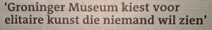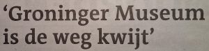 kapitalen wordt op 10 december gesuggereerd dat de RvT zou (hebben) zitten slapen. En ach, we weten allemaal dat benoemingen van leden van de RvT vaak verkapte politieke vriendendiensten zijn die met kennis van beeldende kunst vaak weinig te maken hebben. De nieuwe, inmiddels alweer met vijftig procent ingekorte museumdirectie, heeft na Blühms exit bij uitstek de kans om de luiken open te gooien, een frisse wind te laten waaien en een nieuwe richting in te slaan. Maar ze laat dat na. Dedain voor de eigen regio lijkt een noordelijk stramien: geen Toyistencentrum in Emmen. Geen Helmantelzaal in het Groninger Museum. Geen aandacht voor de huidige Ploeg in het GM.
