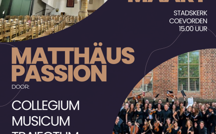 PERSBERICHT: Matthäus Passion in Coevorden Datum: 10 maart 2024 Locatie: Stadskerk Coevorden, Kerkstraat 6 Coevorden Aanvang: 15.00 uur Voor € 29,50 het mooist denkbare muziekstuk in een locatie met de beste akoestiek in Drenthe? Jazeker, dat kan. De Matthäus Passion komt weer in Coevorden. Na de door het publiek zeer gewaardeerde uitvoering van de Matthäus […]