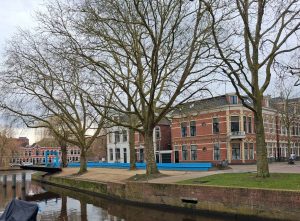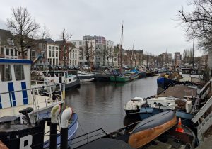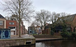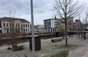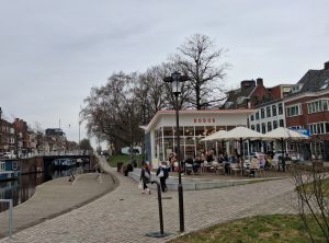 En Groningen? Groningen sukkelt af op een dertien-uit-een-dozijn, oubollige stalen brug als opvolger van de kaduke Visserbrug. ‘Ja,’ zegt de projectleider bij de voorlichting op een zondagmiddag maanden eerder in een Gronings retrocafé royaal, ‘er komen wel sierende details in de leuning.’ Hij bedoelt, vrees ik, een neppe jugendstil-krul aan de vier uiteinden van de leuning, waaraan voetgangers zich plegen vast te klampen, van die noviteiten waar vooroorlogse smeden zich op uitleefden als ze een pisbak voor A’dam smeedden. (foto’s: Terras Dudok Turfsingel, langste bank Winschoterkade, Noorderhaven, Kattenbrug, Reitemakersrijge